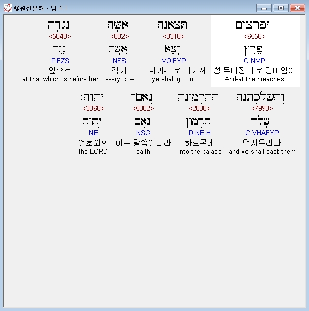 히브리어구약BHS,3 וּפְרָצִים תֵּצֶאנָה אִשָּׁה נֶגְדָּהּ וְהִשְׁלַכְתֶּנָה הַהַרְמֹונָה נְאֻם־יְהוָה׃