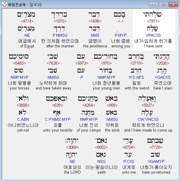 히브리어구약BHS,10 שִׁלַּחְתִּי בָכֶם דֶּבֶר בְּדֶרֶךְ מִצְרַיִם הָרַגְתִּי בַחֶרֶב בַּחוּרֵיכֶם עִם שְׁבִי סוּסֵיכֶם וָאַעֲלֶה בְּאֹשׁ מַחֲנֵיכֶם וּבְאַפְּכֶם וְלֹא־שַׁבְתֶּם עָדַי נְאֻם־יְהוָה׃