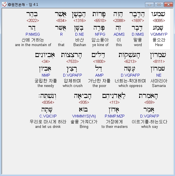 히브리어구약BHS,1 שִׁמְעוּ הַדָּבָר הַזֶּה פָּרֹות הַבָּשָׁן אֲשֶׁר בְּהַר שֹׁמְרֹון הָעֹשְׁקֹות דַּלִּים הָרֹצְצֹות אֶבְיֹונִים הָאֹמְרֹת לַאֲדֹנֵיהֶם הָבִיאָה וְנִשְׁתֶּה׃