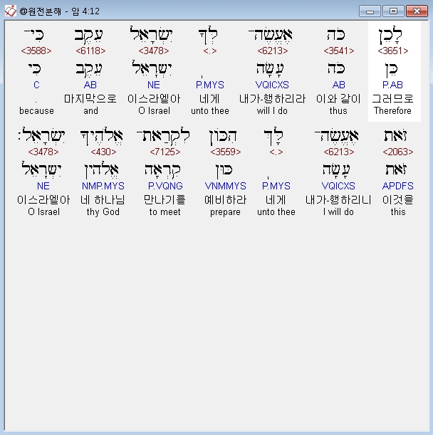 영어NASB,12 "Therefore, thus I will do to you, O Israel; Because I shall do this to you, Prepare to meet your God, O Israel."