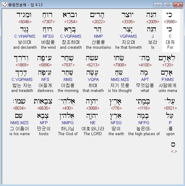 히브리어구약BHS,13 כִּי הִנֵּה יֹוצֵר הָרִים וּבֹרֵא רוּחַ וּמַגִּיד לְאָדָם מַה־שֵּׂחֹו עֹשֵׂה שַׁחַר עֵיפָה וְדֹרֵךְ עַל־בָּמֳתֵי אָרֶץ יְהוָה אֱלֹהֵי־צְבָאֹות שְׁמֹו׃ ס