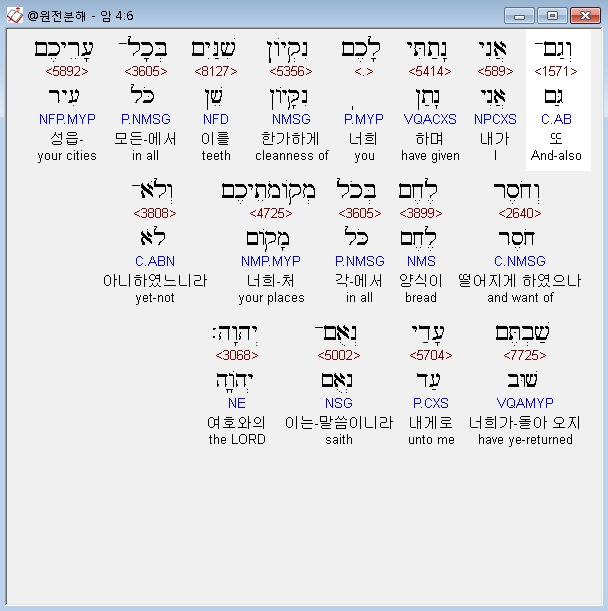 히브리어구약BHS,6 וְגַם־אֲנִי נָתַתִּי לָכֶם נִקְיֹון שִׁנַּיִם בְּכָל־עָרֵיכֶם וְחֹסֶר לֶחֶם בְּכֹל מְקֹומֹתֵיכֶם וְלֹא־שַׁבְתֶּם עָדַי נְאֻם־יְהוָה׃