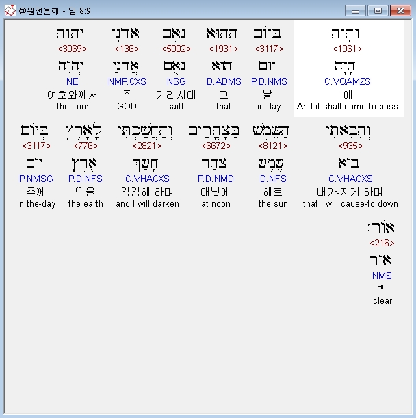 히브리어구약BHS,9 וְהָיָה בַּיֹּום הַהוּא נְאֻם אֲדֹנָי יְהוִה וְהֵבֵאתִי הַשֶּׁמֶשׁ בַּצָּהֳרָיִם וְהַחֲשַׁכְתִּי לָאָרֶץ בְּיֹום אֹור׃