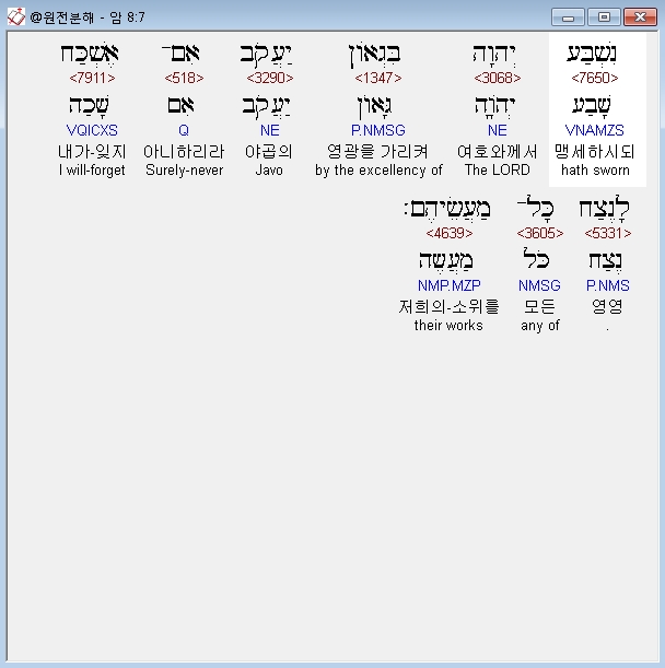 개역개정,7 여호와께서 야곱의 영광을 두고 맹세하시되 내가 그들의 모든 행위를 절대로 잊지 아니하리라 하셨나니