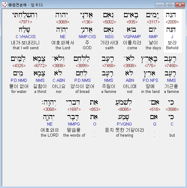 히브리어구약BHS,11 הִנֵּה יָמִים בָּאִים נְאֻם אֲדֹנָי יְהוִה וְהִשְׁלַחְתִּי רָעָב בָּאָרֶץ לֹא־רָעָב לַלֶּחֶם וְלֹא־צָמָא לַמַּיִם כִּי אִם־לִשְׁמֹעַ אֵת דִּבְרֵי יְהוָה׃