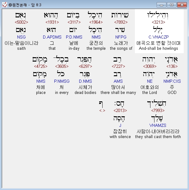 히브리어구약BHS,3 וְהֵילִילוּ שִׁירֹות הֵיכָל בַּיֹּום הַהוּא נְאֻם אֲדֹנָי יְהוִה רַב הַפֶּגֶר בְּכָל־מָקֹום הִשְׁלִיךְ הָס׃ ף