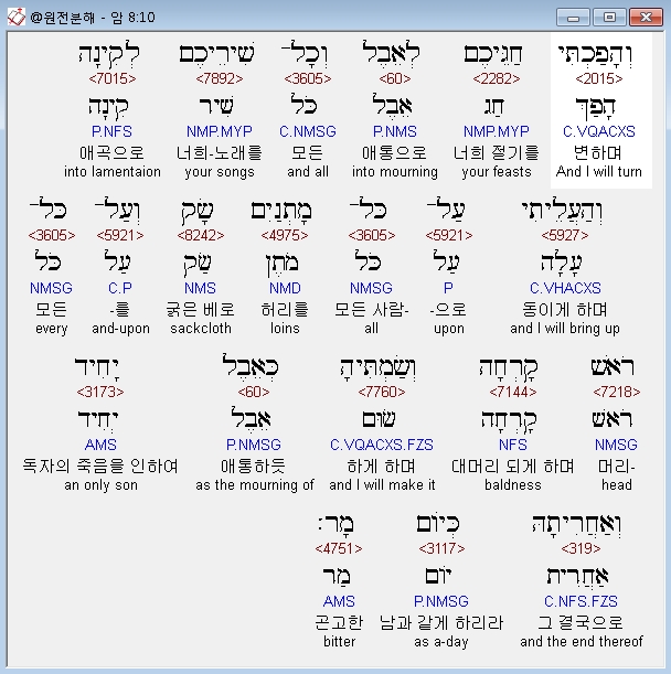 | 히브리어 아모스 9장 전체 원어 원문 성경 공부 주석 강해 설교 해설 해석 (0) | 2020.10.27 |