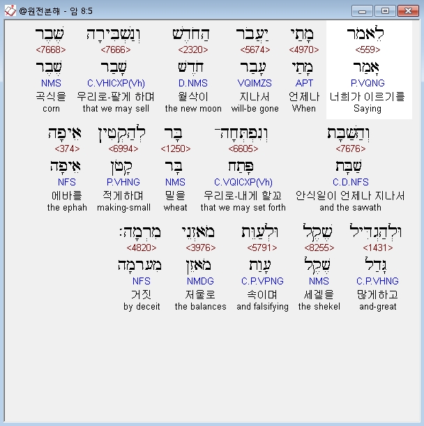 | 히브리어 아모스 5장 전체 원어 원문 성경 공부 주석 강해 설교 해설 해석 (0) | 2020.10.27 |