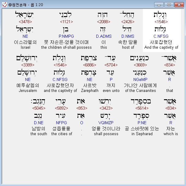 히브리어구약BHS,20 וְגָלֻת הַחֵל־הַזֶּה לִבְנֵי יִשְׂרָאֵל אֲשֶׁר־כְּנַעֲנִים עַד־צָרְפַת וְגָלֻת יְרוּשָׁלִַם אֲשֶׁר בִּסְפָרַד יִרְשׁוּ אֵת עָרֵי הַנֶּגֶב׃