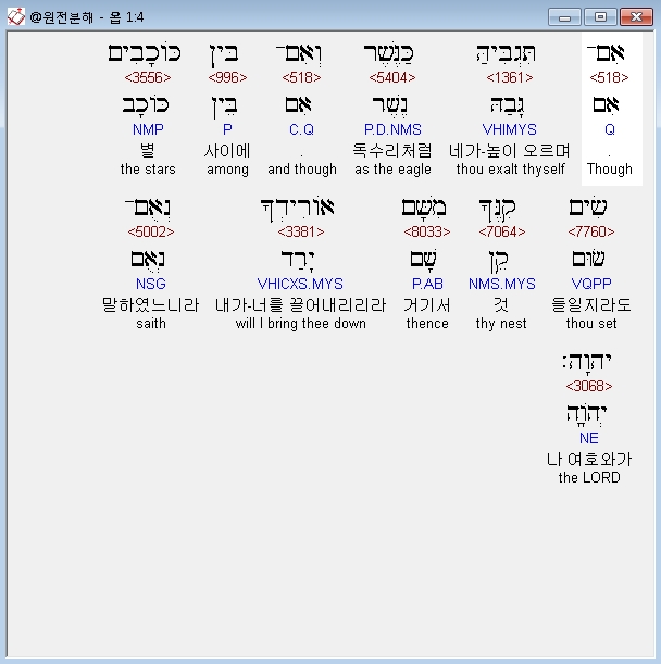히브리어구약BHS,4 אִם־תַּגְבִּיהַּ כַּנֶּשֶׁר וְאִם־בֵּין כֹּוכָבִים שִׂים קִנֶּךָ מִשָּׁם אֹורִידְךָ נְאֻם־יְהוָה׃