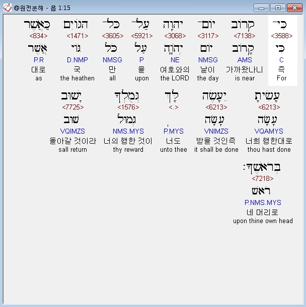 히브리어구약BHS,15 כִּי־קָרֹוב יֹום־יְהוָה עַל־כָּל־הַגֹּויִם כַּאֲשֶׁר עָשִׂיתָ יֵעָשֶׂה לָּךְ גְּמֻלְךָ יָשׁוּב בְּרֹאשֶׁךָ׃