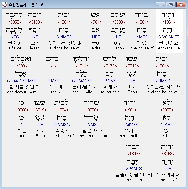 웨하야 베이트 야아콥 에쉬 우베트 요셒 레하바 우베트 에사우 레카쉬 웨달레쿠 바헴 와아칼룸 웨로 이흐예 사리드 레베트 에사우 키 아도나이 딥벨