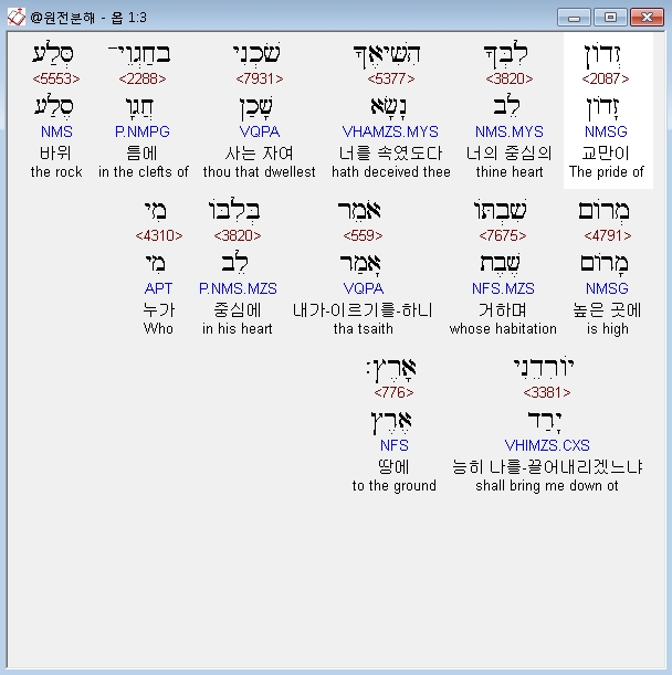 히브리어구약BHS,3 זְדֹון לִבְּךָ הִשִּׁיאֶךָ שֹׁכְנִי בְחַגְוֵי־סֶּלַע מְרֹום שִׁבְתֹּו אֹמֵר בְּלִבֹּו מִי יֹורִדֵנִי אָרֶץ׃