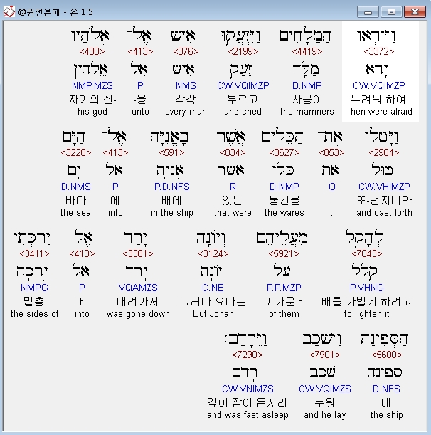 히브리어구약BHS,5 וַיִּירְאוּ הַמַּלָּחִים וַיִּזְעֲקוּ אִישׁ אֶל־אֱלֹהָיו וַיָּטִלוּ אֶת־הַכֵּלִים אֲשֶׁר בָּאֳנִיָּה אֶל־הַיָּם לְהָקֵל מֵעֲלֵיהֶם וְיֹונָה יָרַד אֶל־יַרְכְּתֵי הַסְּפִינָה וַיִּשְׁכַּב וַיֵּרָדַם׃