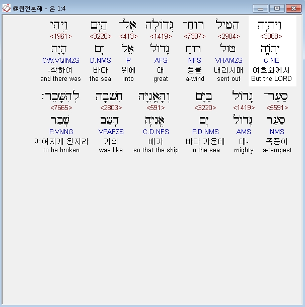 히브리어구약BHS,4 וַיהוָה הֵטִיל רוּחַ־גְּדֹולָה אֶל־הַיָּם וַיְהִי סַעַר־גָּדֹול בַּיָּם וְהָאֳנִיָּה חִשְּׁבָה לְהִשָּׁבֵר׃