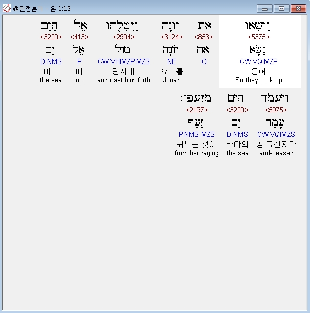 히브리어구약BHS,15 וַיִּשְׂאוּ אֶת־יֹונָה וַיְטִלֻהוּ אֶל־הַיָּם וַיַּעֲמֹד הַיָּם מִזַּעְפֹּו׃