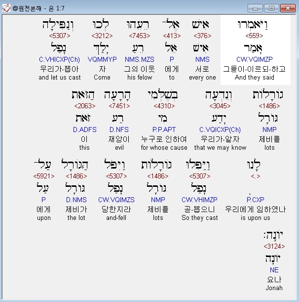 히브리어구약BHS,7 וַיֹּאמְרוּ אִישׁ אֶל־רֵעֵהוּ לְכוּ וְנַפִּילָה גֹורָלֹות וְנֵדְעָה בְּשֶׁלְּמִי הָרָעָה הַזֹּאת לָנוּ וַיַּפִּלוּ גֹּורָלֹות וַיִּפֹּל הַגֹּורָל עַל־יֹונָה׃