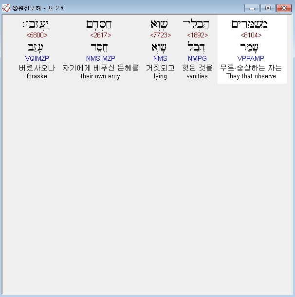 히브리어구약BHS,8 מְשַׁמְּרִים הַבְלֵי־שָׁוְא חַסְדָּם יַעֲזֹבוּ׃