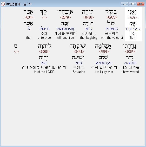 히브리어구약BHS,9 וַאֲנִי בְּקֹול תֹּודָה אֶזְבְּחָה־לָּךְ אֲשֶׁר נָדַרְתִּי אֲשַׁלֵּמָה יְשׁוּעָתָה לַיהוָה׃ ס