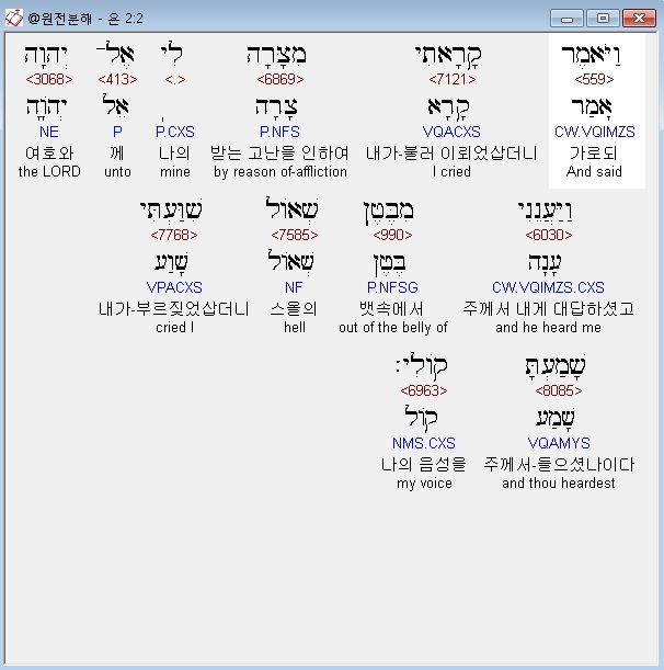 히브리어구약BHS,2 וַיֹּאמֶר קָרָאתִי מִצָּרָה לִי אֶל־יְהוָה וַיַּעֲנֵנִי מִבֶּטֶן שְׁאֹול שִׁוַּעְתִּי שָׁמַעְתָּ קֹולִי׃