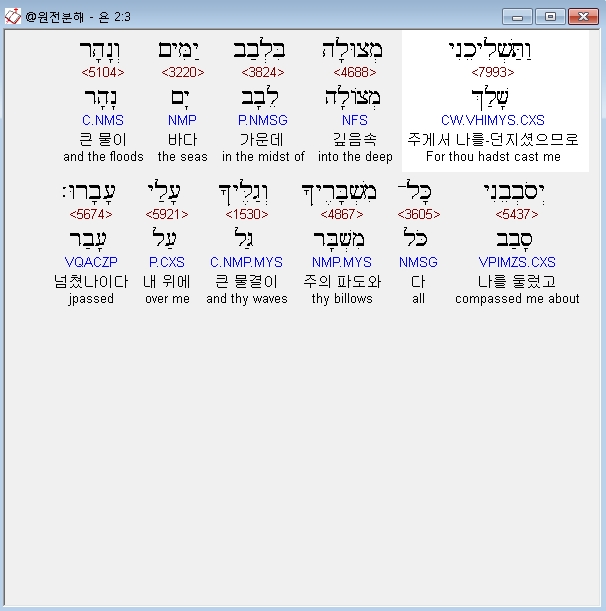 히브리어구약BHS,3 וַתַּשְׁלִיכֵנִי מְצוּלָה בִּלְבַב יַמִּים וְנָהָר יְסֹבְבֵנִי כָּל־מִשְׁבָּרֶיךָ וְגַלֶּיךָ עָלַי עָבָרוּ׃