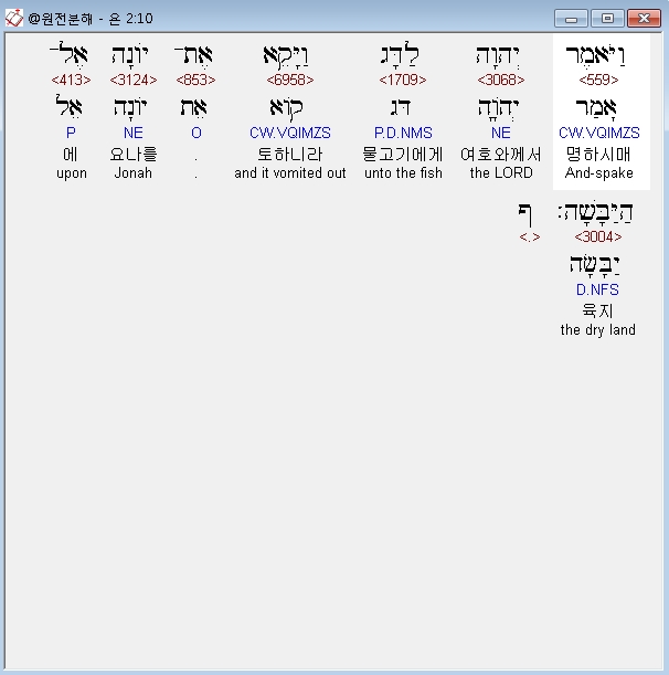 히브리어구약BHS,10 וַיֹּאמֶר יְהוָה לַדָּג וַיָּקֵא אֶת־יֹונָה אֶל־הַיַּבָּשָׁה׃ ף