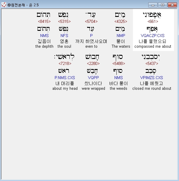 히브리어구약BHS,5 אֲפָפוּנִי מַיִם עַד־נֶפֶשׁ תְּהֹום יְסֹבְבֵנִי סוּף חָבוּשׁ לְרֹאשִׁי׃