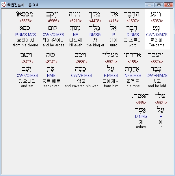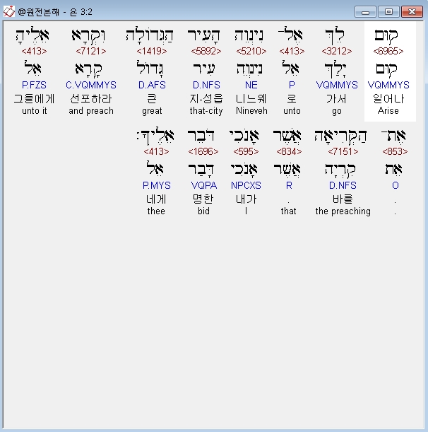 | 히브리어 요나 1장 전체 원어 원문 성경 공부 주석 강해 설교 해설 해석 (0) | 2020.10.27 |