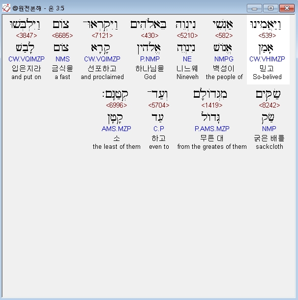 히브리어구약BHS,5 וַיַּאֲמִינוּ אַנְשֵׁי נִינְוֵה בֵּאלֹהִים וַיִּקְרְאוּ־צֹום וַיִּלְבְּשׁוּ שַׂקִּים מִגְּדֹולָם וְעַד־קְטַנָּם׃