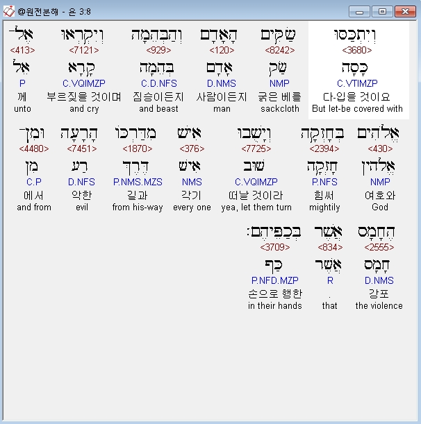 히브리어구약BHS,8 וְיִתְכַּסּוּ שַׂקִּים הָאָדָם וְהַבְּהֵמָה וְיִקְרְאוּ אֶל־אֱלֹהִים בְּחָזְקָה וְיָשֻׁבוּ אִישׁ מִדַּרְכֹּו הָרָעָה וּמִן־הֶחָמָס אֲשֶׁר בְּכַפֵּיהֶם׃