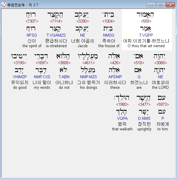 히브리어구약BHS,7 הֶאָמוּר בֵּית־יַעֲקֹב הֲקָצַר רוּחַ יְהוָה אִם־אֵלֶּה מַעֲלָלָיו הֲלֹוא דְבָרַי יֵיטִיבוּ עִם הַיָּשָׁר הֹולֵךְ׃