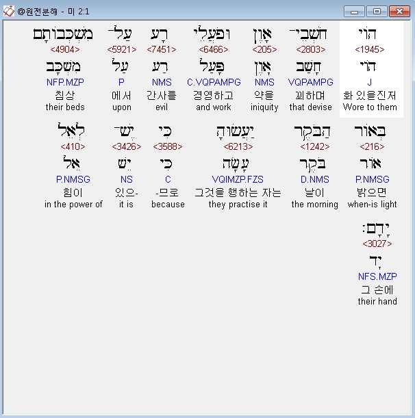 히브리어구약BHS,1 הֹוי חֹשְׁבֵי־אָוֶן וּפֹעֲלֵי רָע עַל־מִשְׁכְּבֹותָם בְּאֹור הַבֹּקֶר יַעֲשׂוּהָ כִּי יֶשׁ־לְאֵל יָדָם׃