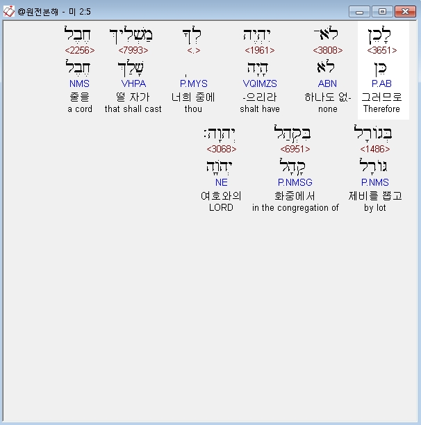 히브리어구약BHS,5 לָכֵן לֹא־יִהְיֶה לְךָ מַשְׁלִיךְ חֶבֶל בְּגֹורָל בִּקְהַל יְהוָה׃
