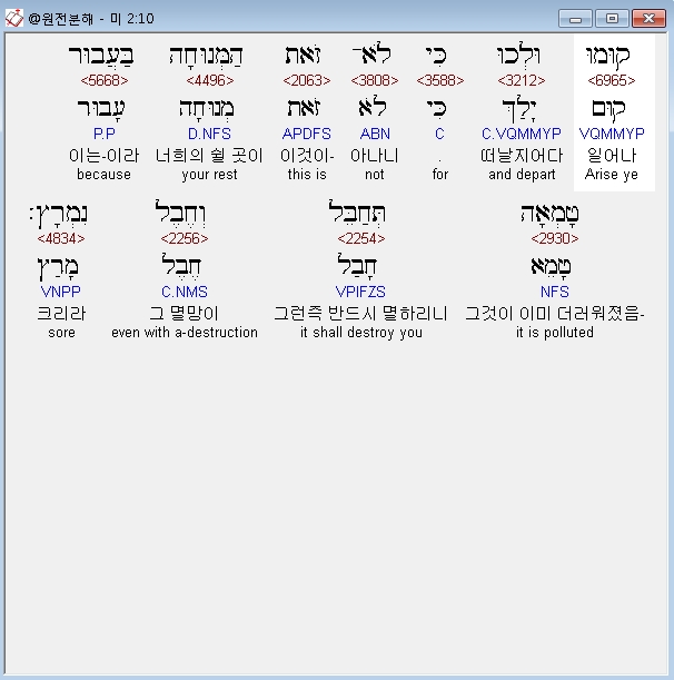 히브리어구약BHS,10 קוּמוּ וּלְכוּ כִּי לֹא־זֹאת הַמְּנוּחָה בַּעֲבוּר טָמְאָה תְּחַבֵּל וְחֶבֶל נִמְרָץ׃