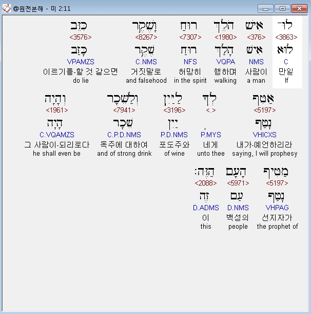 히브리어구약BHS,11 לוּ־אִישׁ הֹלֵךְ רוּחַ וָשֶׁקֶר כִּזֵּב אַטִּף לְךָ לַיַּיִן וְלַשֵּׁכָר וְהָיָה מַטִּיף הָעָם הַזֶּה׃