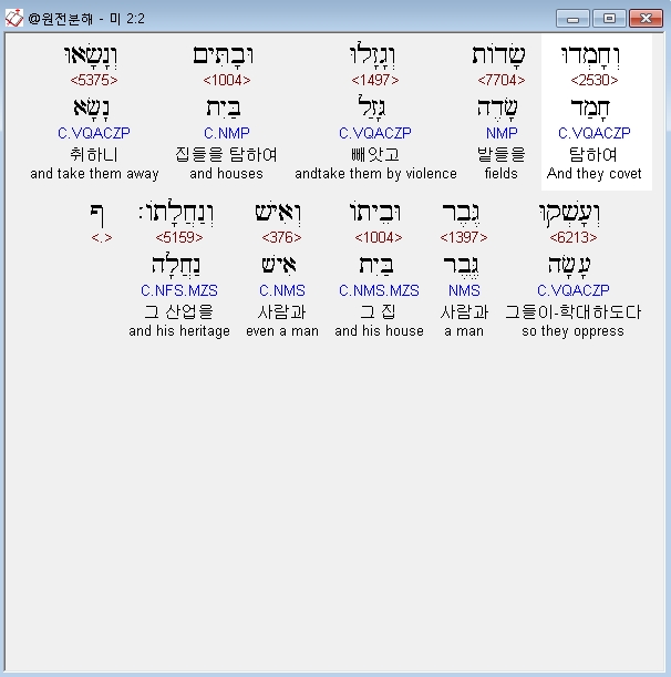 히브리어구약BHS,2 וְחָמְדוּ שָׂדֹות וְגָזָלוּ וּבָתִּים וְנָשָׂאוּ וְעָשְׁקוּ גֶּבֶר וּבֵיתֹו וְאִישׁ וְנַחֲלָתֹו׃ ף