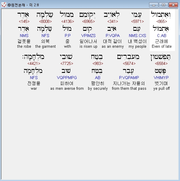 히브리어구약BHS,8 וְאֶתְמוּל עַמִּי לְאֹויֵב יְקֹוםֵם מִמּוּל שַׂלְמָה אֶדֶר תַּפְשִׁטוּן מֵעֹבְרִים בֶּטַח שׁוּבֵי מִלְחָמָה׃