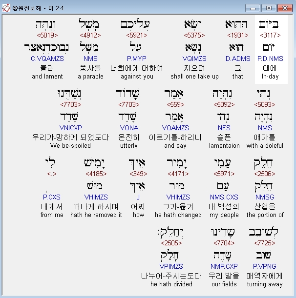 | 히브리어 미가 4장 전체 원어 원문 성경 공부 주석 강해 설교 해설 해석 (0) | 2020.10.27 |