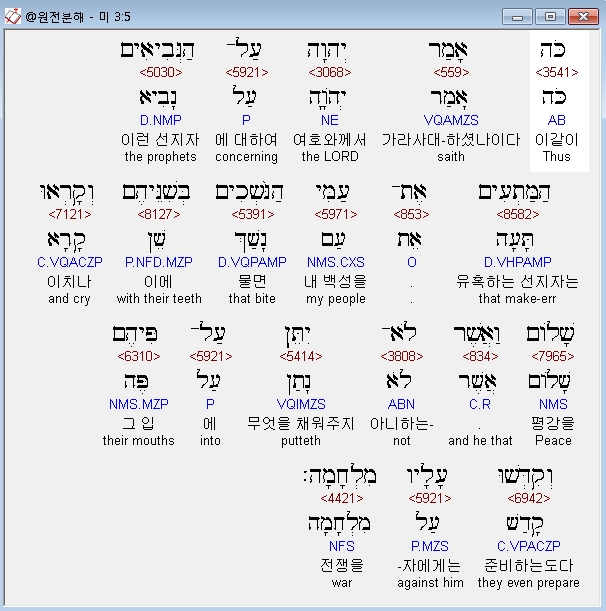 히브리어구약BHS,5 כֹּה אָמַר יְהוָה עַל־הַנְּבִיאִים הַמַּתְעִים אֶת־עַמִּי הַנֹּשְׁכִים בְּשִׁנֵּיהֶם וְקָרְאוּ שָׁלֹום וַאֲשֶׁר לֹא־יִתֵּן עַל־פִּיהֶם וְקִדְּשׁוּ עָלָיו מִלְחָמָה׃