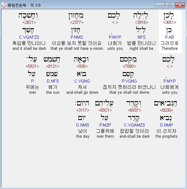 히브리어구약BHS,6 לָכֵן לַיְלָה לָכֶם מֵחָזֹון וְחָשְׁכָה לָכֶם מִקְּסֹם וּבָאָה הַשֶּׁמֶשׁ עַל־הַנְּבִיאִים וְקָדַר עֲלֵיהֶם הַיֹּום׃