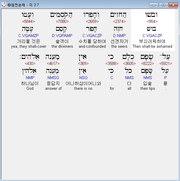 히브리어구약BHS,7 וּבֹשׁוּ* הַחֹזִים וְחָפְרוּ הַקֹּסְמִים וְעָטוּ עַל־שָׂפָם כֻּלָּם כִּי אֵין מַעֲנֵה אֱלֹהִים׃