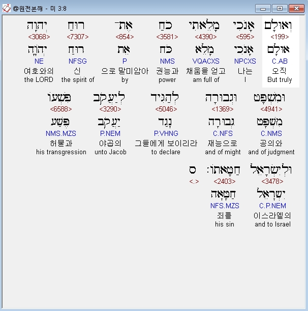 히브리어구약BHS,8 וְאוּלָם אָנֹכִי מָלֵאתִי כֹחַ אֶת־רוּחַ יְהוָה וּמִשְׁפָּט וּגְבוּרָה לְהַגִּיד לְיַעֲקֹב פִּשְׁעֹו וּלְיִשְׂרָאֵל חַטָּאתֹו׃ ס