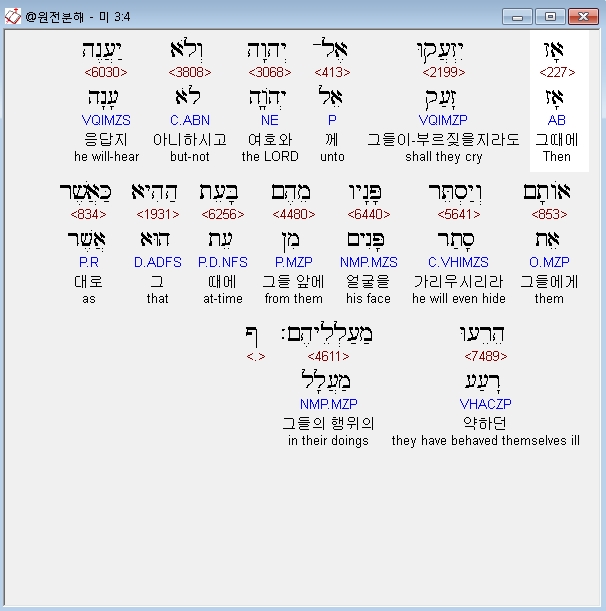히브리어구약BHS,4 אָז יִזְעֲקוּ אֶל־יְהוָה וְלֹא יַעֲנֶה אֹותָם וְיַסְתֵּר פָּנָיו מֵהֶם בָּעֵת הַהִיא כַּאֲשֶׁר הֵרֵעוּ מַעַלְלֵיהֶם׃ ף