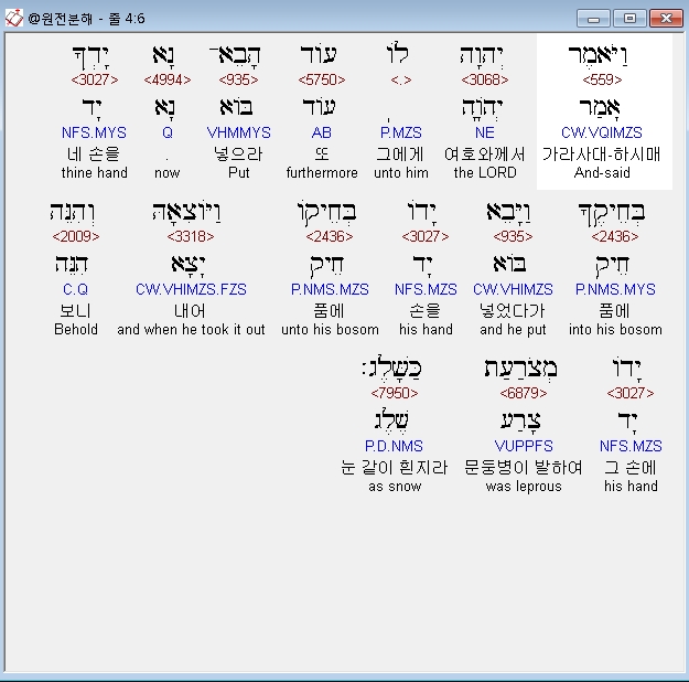 히브리어구약BHS,6 וַיֹּאמֶר יְהוָה לֹו עֹוד הָבֵא־נָא יָדְךָ בְּחֵיקֶךָ וַיָּבֵא יָדֹו בְּחֵיקֹו וַיֹּוצִאָהּ וְהִנֵּה יָדֹו מְצֹרַעַת כַּשָּׁלֶג׃