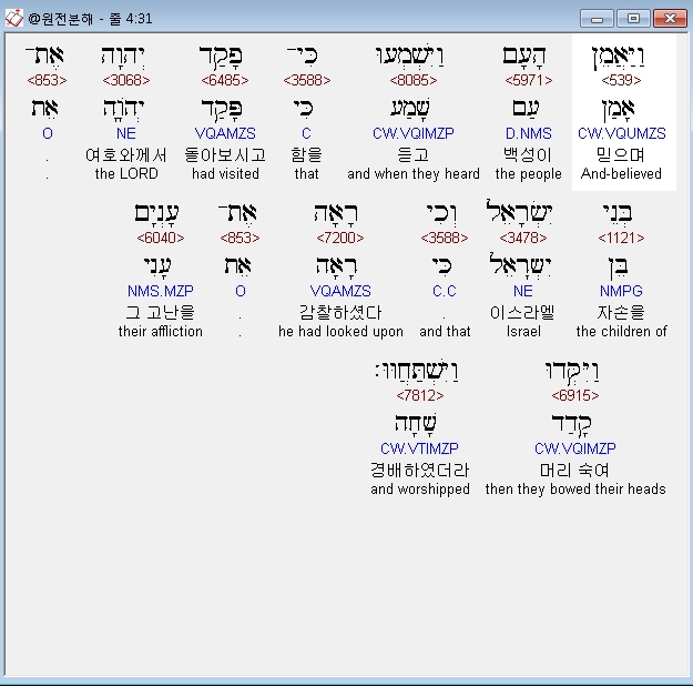 히브리어구약BHS,31 וַיַּאֲמֵן הָעָם וַיִּשְׁמְעוּ כִּי־פָקַד יְהוָה אֶת־בְּנֵי יִשְׂרָאֵל וְכִי רָאָה אֶת־עָנְיָם וַיִּקְּדוּ וַיִּשְׁתַּחֲוּוּ׃