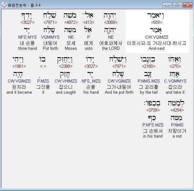히브리어구약BHS,4 וַיֹּאמֶר יְהוָה אֶל־מֹשֶׁה שְׁלַח יָדְךָ וֶאֱחֹז בִּזְנָבֹו וַיִּשְׁלַח יָדֹו וַיַּחֲזֶק בֹּו וַיְהִי לְמַטֶּה בְּכַפֹּו׃