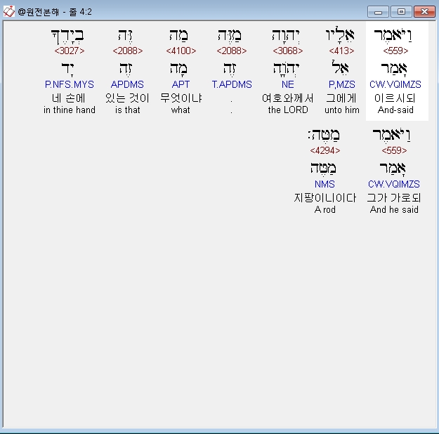 히브리어구약BHS,2 וַיֹּאמֶר אֵלָיו יְהוָה [כ= מַזֶּה] [ק= מַה] [ק= ] [ק=־זֶּה] בְיָדֶךָ וַיֹּאמֶר מַטֶּה׃