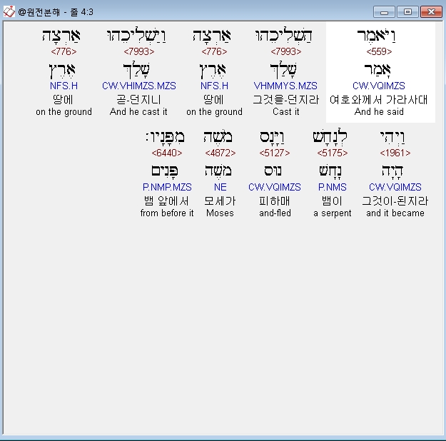 히브리어구약BHS,3 וַיֹּאמֶר הַשְׁלִיכֵהוּ אַרְצָה וַיַּשְׁלִיכֵהוּ אַרְצָה וַיְהִי לְנָחָשׁ וַיָּנָס מֹשֶׁה מִפָּנָיו׃