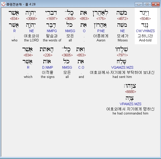 영어NASB,28 And Moses told Aaron all the words of the LORD with which He had sent him, and all the signs that He had commanded him to do.