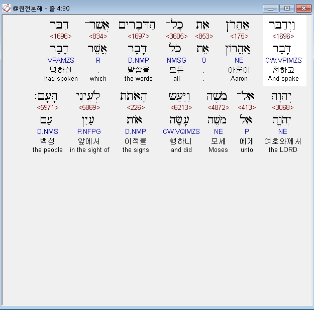 히브리어구약BHS,30 וַיְדַבֵּר אַהֲרֹן אֵת כָּל־הַדְּבָרִים אֲשֶׁר־דִּבֶּר יְהוָה אֶל־מֹשֶׁה וַיַּעַשׂ הָאֹתֹת לְעֵינֵי הָעָם׃